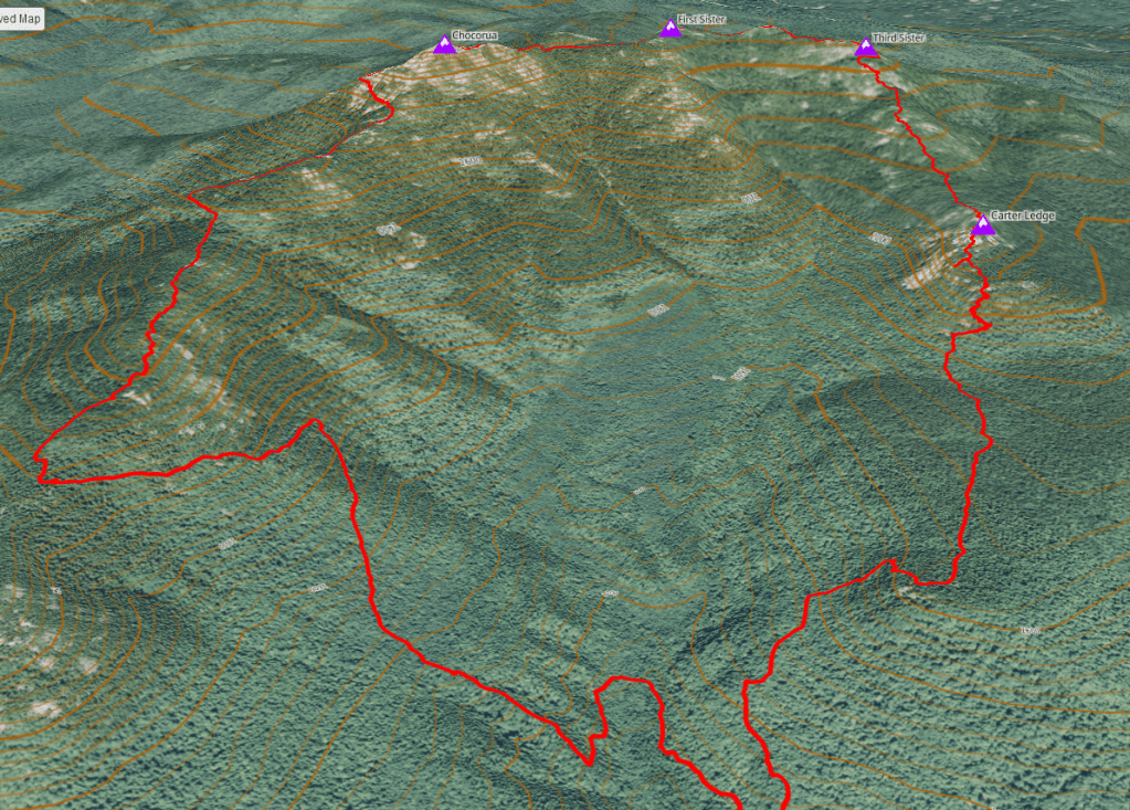 I decided on a counter clockwise traverse of the ancient cirque, first climbing up to The Sisters via Carter ledge then traversing over to the Chocorua summit and descending via the Liberty and Weetamoo trails. I would go in a pretty aggressive style with trail running shoes, poles, and a 5L vest pack. Carrying 2L of water, gels and electrolyte mix, my emergency kit and EPIRB, as well as a light rain jacket. Conditions were forecast to be warm but overcast with likely showers throughout the day.