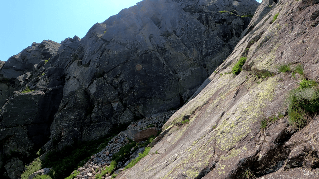 Breaking off towards Huntington, the trail is well marked and several narrow ski/rescue access paths wind along the same route up into the ravine. The steep North wall was looking bigger all the time as I picked my way across the boulder field called “The Fan”.