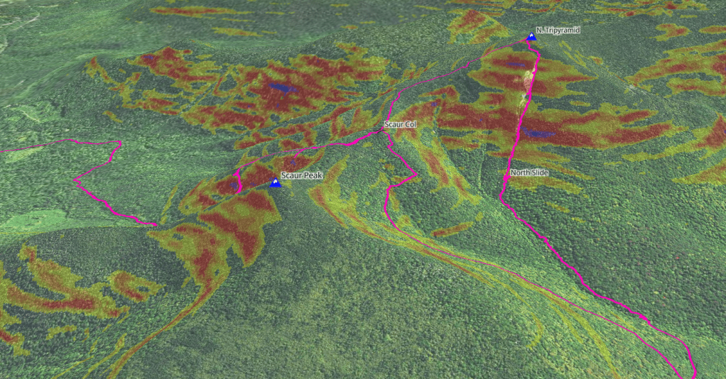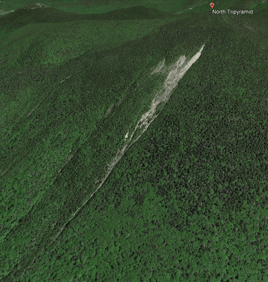The Tripyramid slides in the Sandwich Range are likely not so well known. Such “slides” can be found throughout the region; they are essentially large land slide scars where the topsoil has eroded down to the underlying rock slab. This particular feature rises ~1300 ft at an angle of 30-35° and constitutes one of New Hampshire’s “Terrifying 25” .