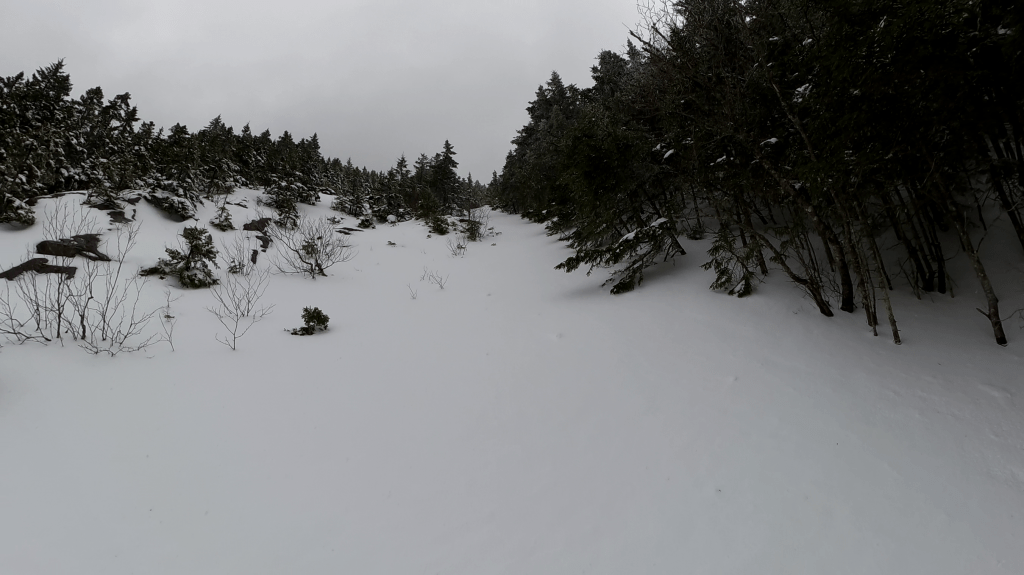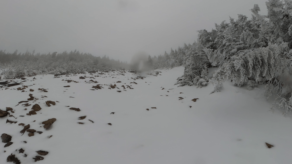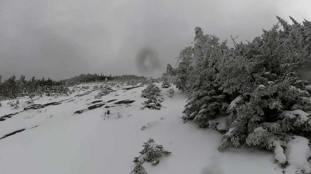 As I reached the top of the slide, visibility was starting to get poor with intermittent sleet/rain. I kept moving up into the trackless snow drifted forest around the summit and eventually popped out into a small clearing where 3 trails intersected.